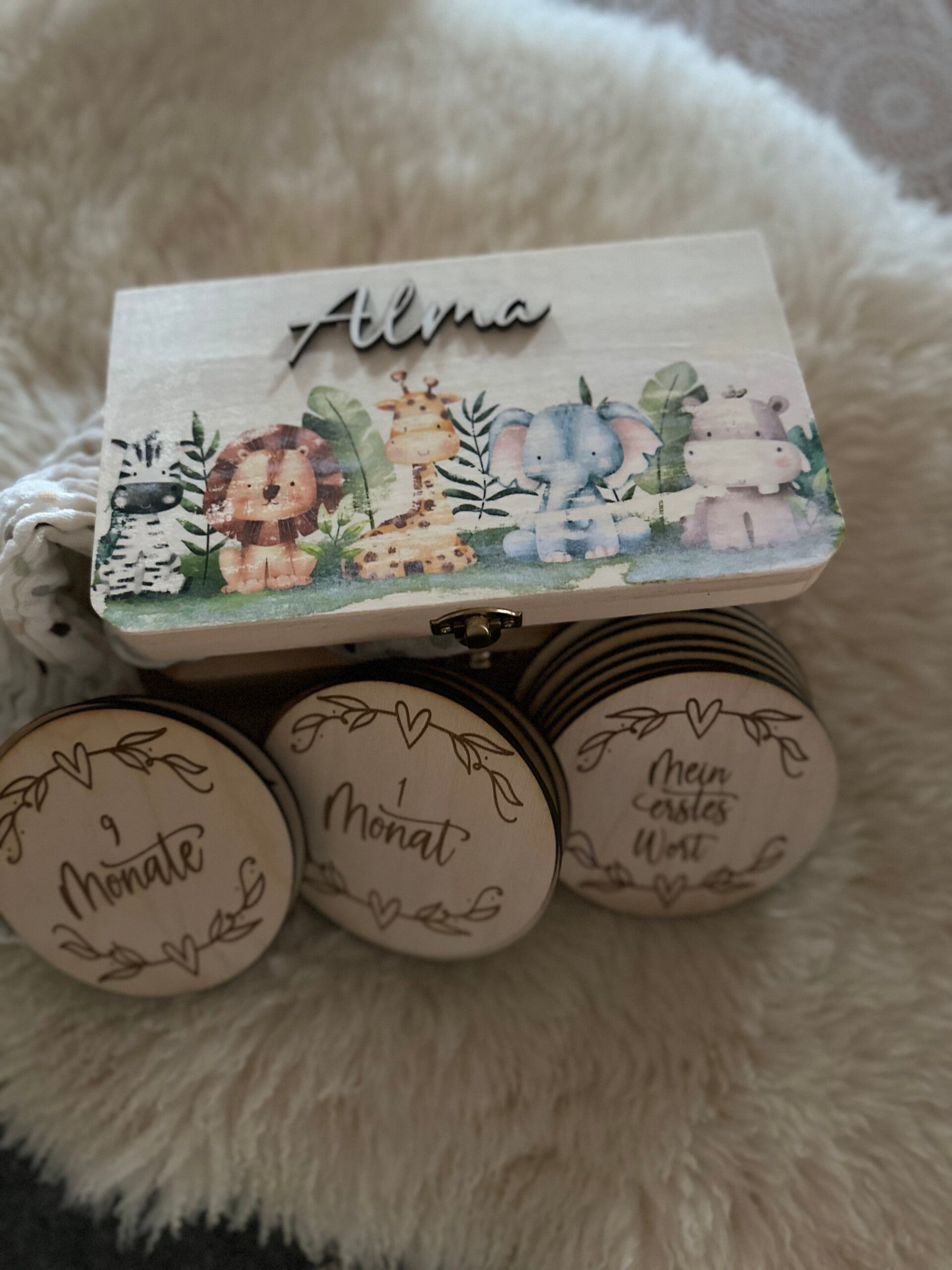 Liebevoll, handgefertigte Meilensteine mit personalisierter Aufbewahrungsbox.