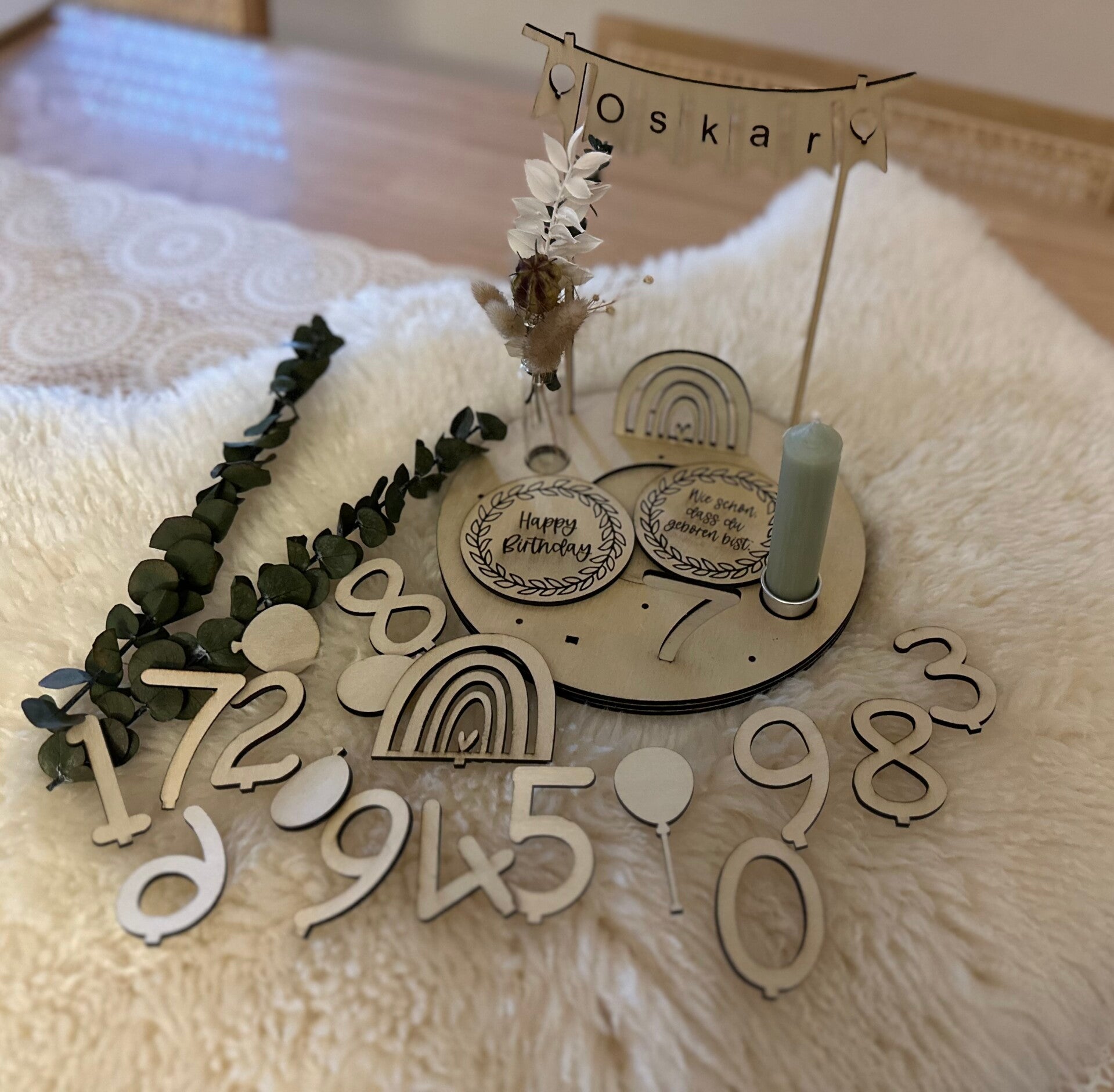 Dieser wunderschöne Geburtstagsteller ist aus 4mm Pappelholz und einem Diodenlaser hergestellt. Dazu gibt es Zahlen von 0-9 , Regenbogen zum Aufstecken, eine kleine salbeifarbene Stabkerze, ein kleines Trockenblumenstäußchen.